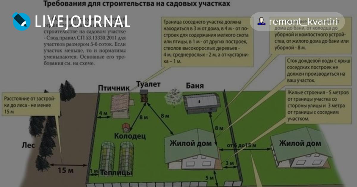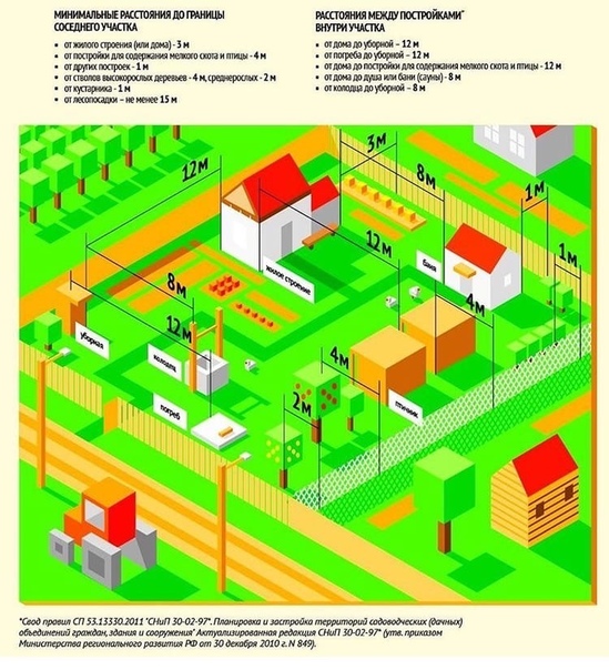 Основной законодательный документ, в котором прописаны правила строительства любых объектов, называется СНиП — Строительные Нормы и Правила. Он описывает характеристики построек и правила их расположения согласно архитектурных, противопожарных и санитарных требований. Данные требования необходимо учитывать не только, чтобы не ошибиться самому, но и для проверки соседей.