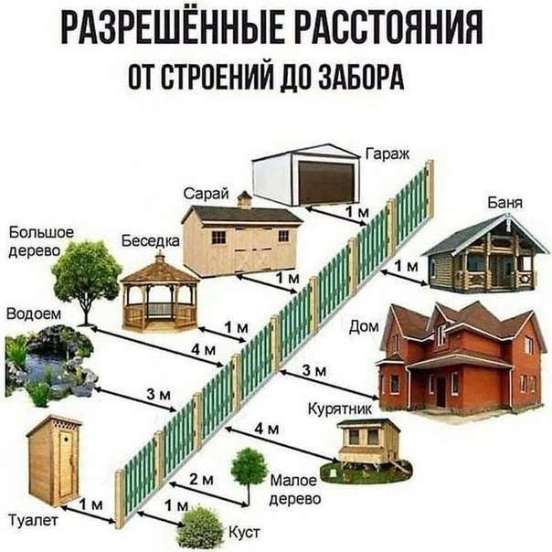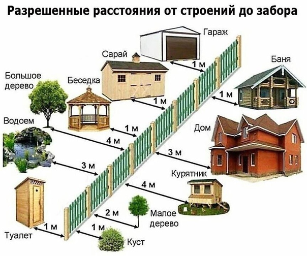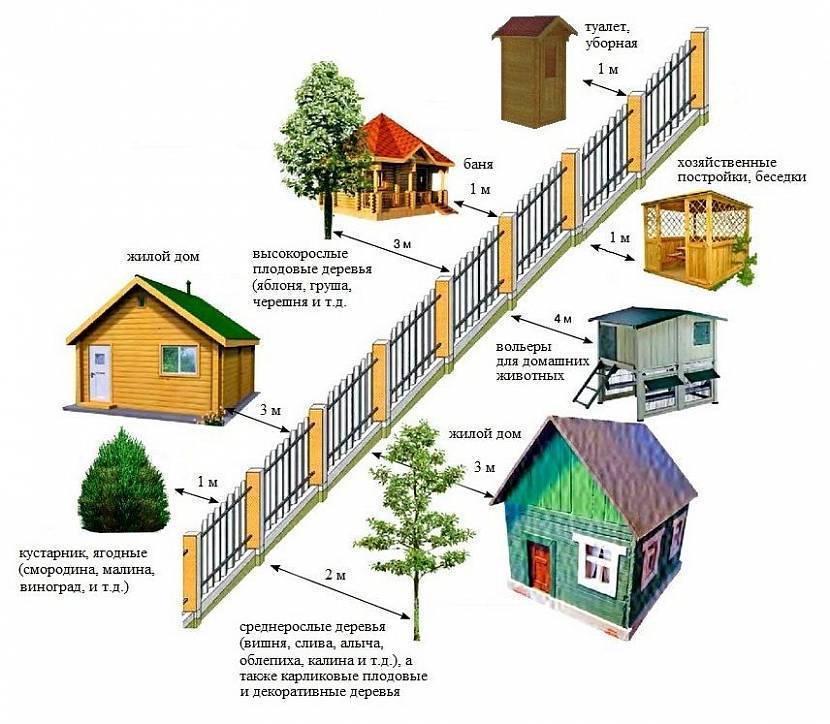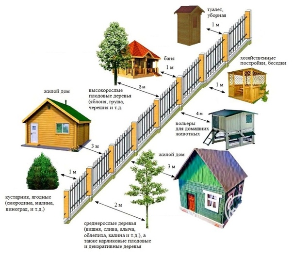 Существуют определенные ограничения, связанные с минимальным расстоянием от построек и насаждений до забора между соседями.