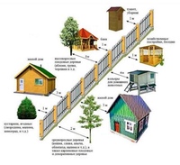Речь идет о коптильнях, барбекю, мангалах. - Зеленые насаждения. Согласно правилам посадки зеленых насаждений высокорослые деревья можно высаживать на расстоянии трех метров от забора, для среднерослых эта дистанция уменьшается до двух метров. Ягодные кустарники и декоративные растения сажают, отступив от изгороди один метр. Для цветников и клумб нормы посадки не указаны, поэтому их можно разбивать вплотную к изгороди.