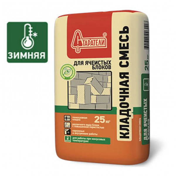Самая распространенная летняя смесь — Клей марки ACS. Его можно использовать при температуре от +10 до +25 градусов для кладки стен и различных перегородок. Он экономичен, удобен и обладает отличными водоотталкивающими свойствами.Цена от 185 рублей за 25 кг.
