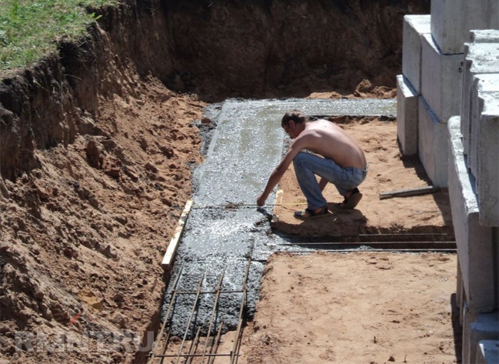 Чтобы почва не ослабляла фундамент, перед укладкой блоков котлован заливают бетонным раствором с армированием. Получается единая конструкция, принимающая на себя нагрузку от пучения грунта в период его замораживания и оттаивания.