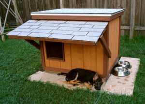 Для крыши не стоит использовать металл, так как под палящим солнцем он быстро накалится, создавая невыносимые условия в будке для питомца. Плоскую откидную крышу допустимо делать только в крытом вольере. Если помещение для собаки будет классической модели, то навес крыши со стороны лаза следует сделать больше на 60 см, что защитит животное от дождя, снега и сильного ветра.