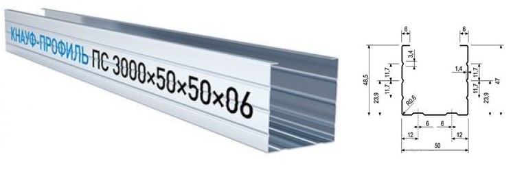 Стоечный профиль для гипсокартона имеет высокую жесткость и П-образное строение с дополнительными полочками и ребрами жесткости, необходимые для придания ему большей жесткости. Различают следующие размеры: