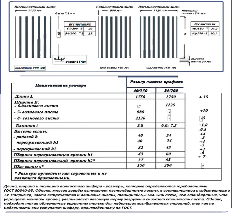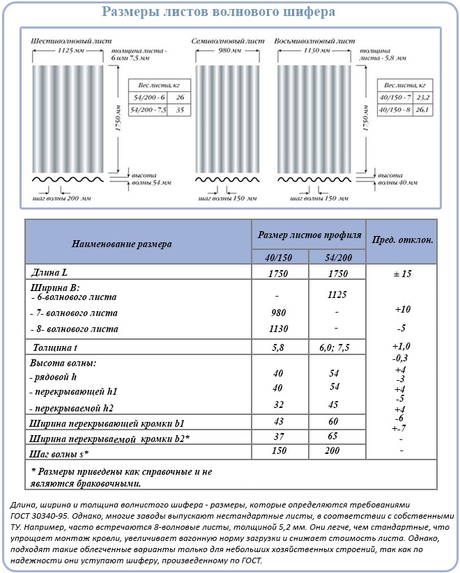 Каждый мастер должен знать, что по виду весь шифер делят на плоский и волновой. При этом что касается волнового материала, то он может иметь 5, 6, 7 или 8 волн в своей форме. Важно понимать, что все покрытие подобного плана производят строго по ГОСТ 30340-95. То есть размеры шифера (каждого определенного вида) имеют определенные параметры и отклонения от них невозможны.