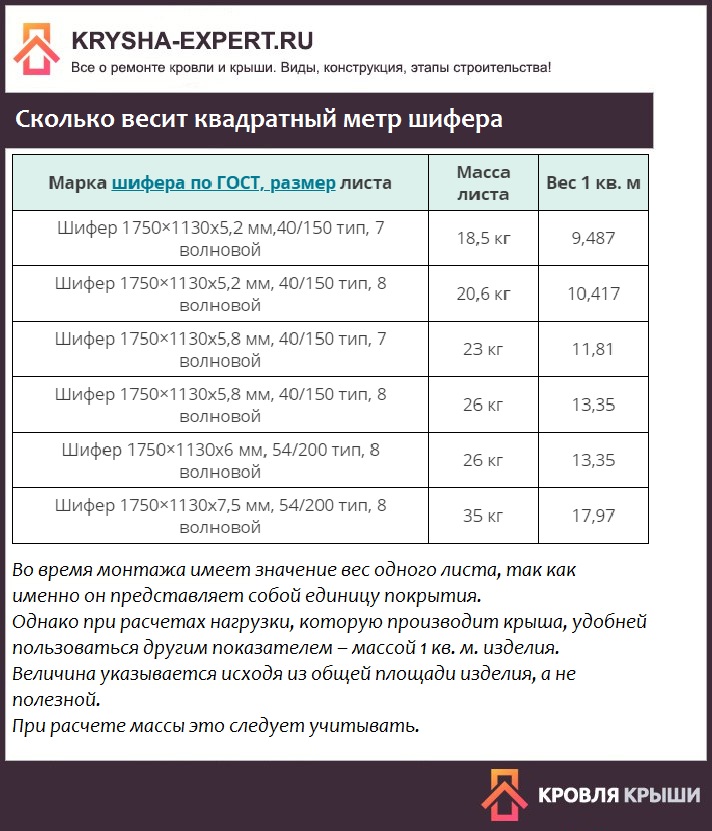 Подсчитано, что вес шифера на 1 квадратный метр кровли составляет от 10 до 14 килограммов в зависимости от толщины листа.