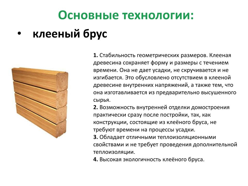 Клееный брус изготавливается с использованием высоких технологий, не требует внутренней или внешней отделки, не меняет геометрических форм вне зависимости от атмосферных воздействий и статической нагрузки. Материал прост в монтаже, не дает усадки и потому позволяет быстро построить дом.