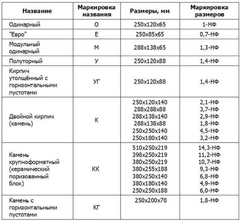 Каждая партия произведённых кирпичей маркируется. Буквенно-цифровой код содержит в себе информацию об изделии: • маркировка название изделия, буквы Р — для рядовых, Л — для лицевых; ● Для примера разберём кирпич с маркировкой КОРПу 1НФ/100/1,4/50/ГОСТ 530-2012: - кирпич керамический рядовой, пустотелый, утолщённый, размеры 1,4 НФ (250х120х88 мм), марка по прочности М100, класс средней плотности 1,4 (условно-эффективный по теплотехническим характеристикам), марка по морозостойкости F50, произведён согласно ГОСТ 530-2012. • Другой пример: кирпич СОР-150/15/ГОСТ 379-95 — кирпич силикатный одинарный рядовой с маркой по прочности М150, по морозостойкости F15, произведён согласно ГОСТ 379-95.