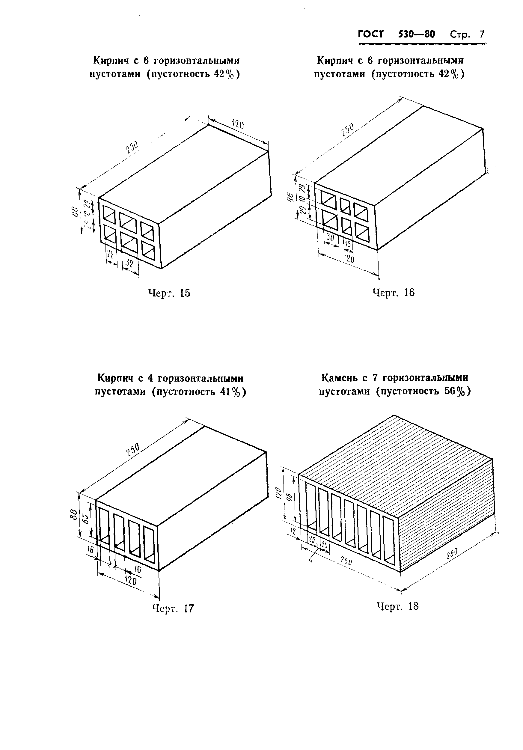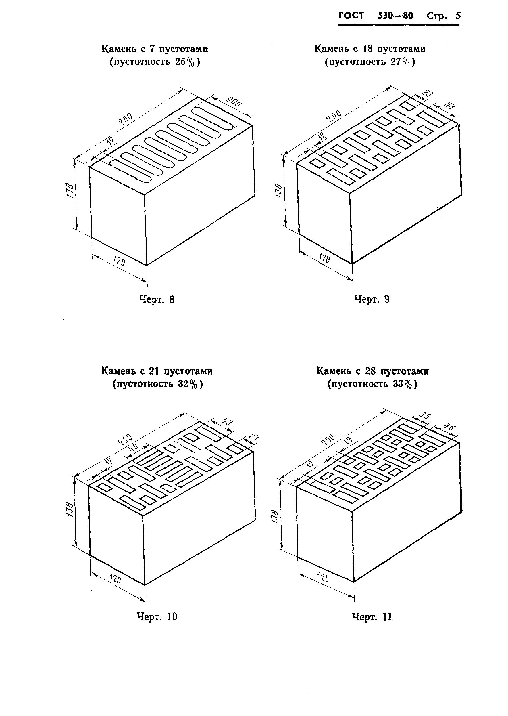 2.3. Одинарный и утолщенный кирпич изготовляют полнотелым (без пустот и с технологическими пустотами, объем которых составляет не более 13 %) и пустотелым, а камни — только пустотелыми.