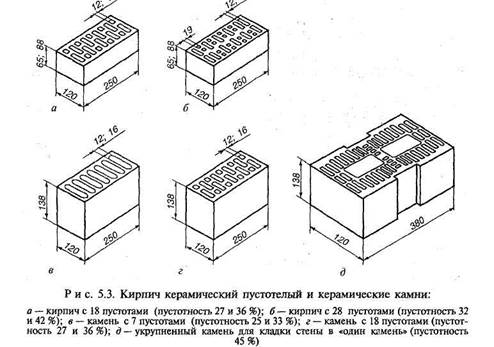 Ширина щелевидных пустот должна быть не более 16 мм, а диаметр цилиндрических сквозных пустот и размер стороны квадратных пустот — не более 20 мм. Для укрупненных камней допускаются пустоты (для захвата при кладке) с площадью сечения пустот не более 13 % от площади основания. Диаметр несквозных пустот и размеры горизонтальных пустот не регламентируют.