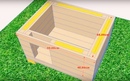 Работы начинаются с изготовления дна будки. По имеющимся размерам из бруса сечением 50 х 100 мм делается рамка и скрепляется в паз или встык, фиксируется гвоздями или саморезами. Изготовленная конструкция со всех сторон обрабатывается противогнилостными препаратами, а при их отсутствии — олифой. После ее высыхания красится масляной краской. Такая обработка защитит материал от влаги и, соответственно, от гниения. Затем из бруска 50 х 50 мм изготавливаются стойки и устанавливаются вертикально по углам короба и со стороны предполагаемого лаза, с двух сторон от него.