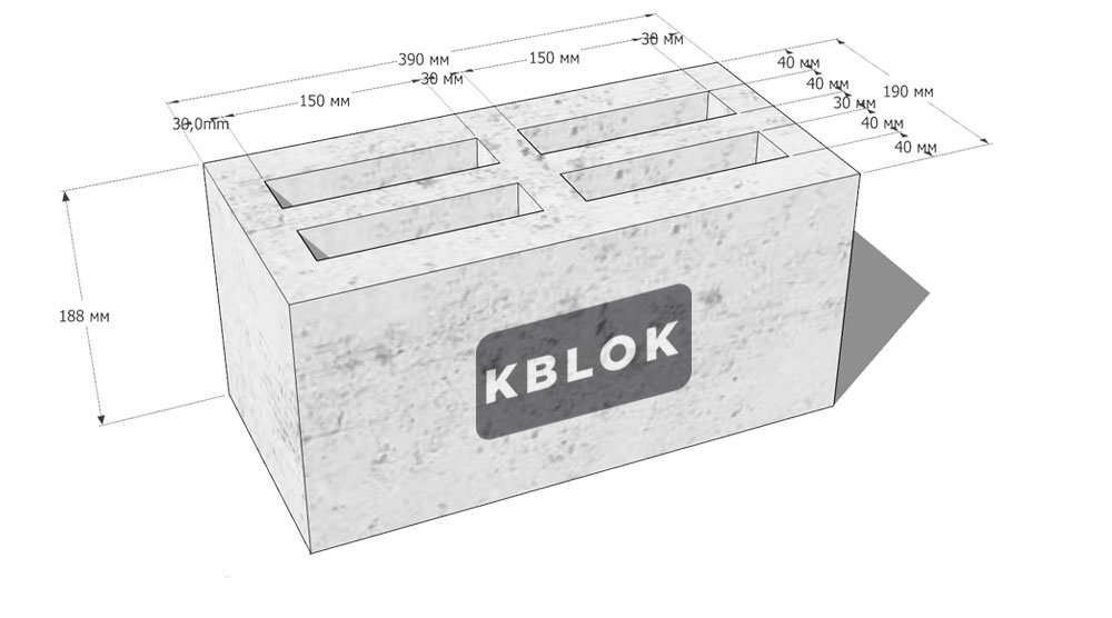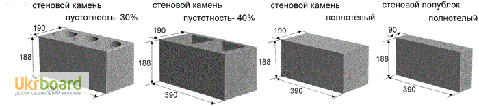 Стандартные полнотелые и пустотелые стеновые блоки имеют размер 390х190х190 мм (или 400х200х200 мм в кладке). Также часто можно встретить пустотелые полублоки, размеры которых 390х120х190 мм или 390х90х190 мм.