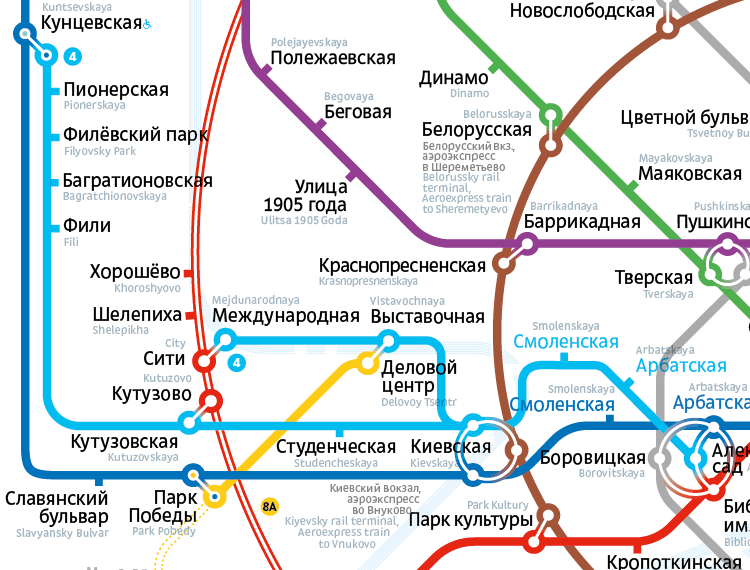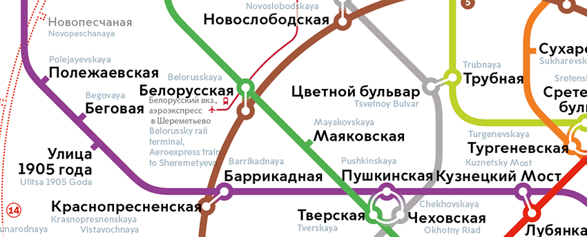 Например, чтобы «Пушкинская» на картинке внизу влезла между линиями, предлагаем подвинуть зеленую ветку влево. После надо немного опустить пересадку на «Белорусской» и решить, что сделать с «Беговой». Да, у нас еще «Кузнецкий Мост» не помещается. И «Трубная». А если сдвинуть вправо оранжевую ветку? И так по всей схеме.
