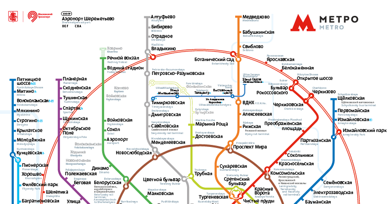 В разгар проектирования приходит пожелание от заказчика: поменять шрифт на Москоу Санс, чтобы схема была выполнена в едином стиле с транспортной навигацией. Москоу Санс отличается от Директа, использованного в схеме, пропорциями букв — слова, набранные им, получаются шире, — поэтому замена шрифта влечет за собой изменение схемы.