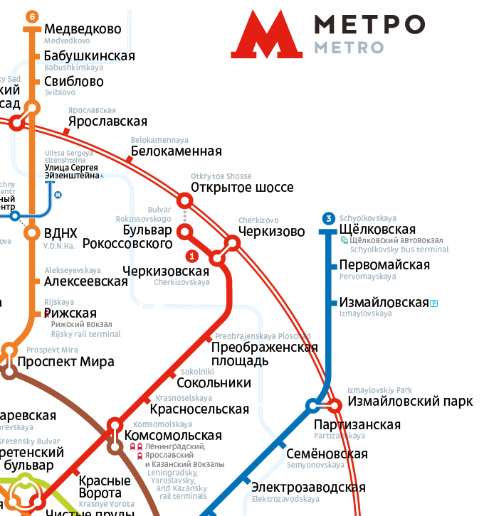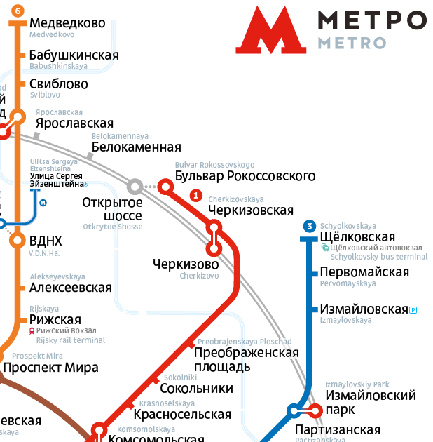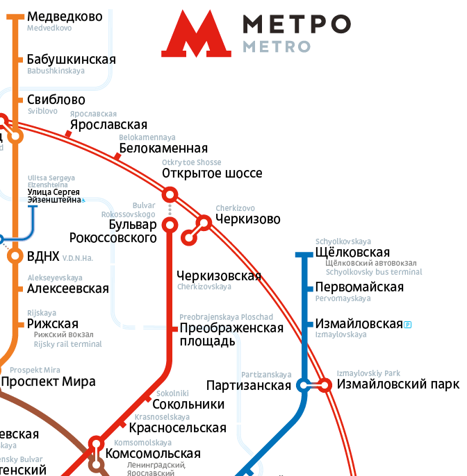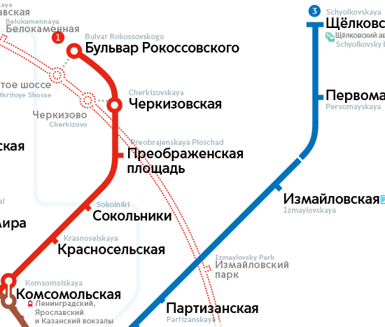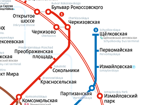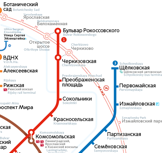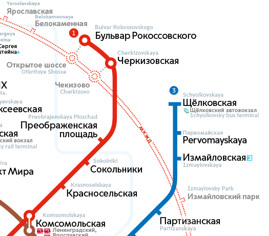 Оказывается, пересадка «Черкизово» — «Черкизовская» будет располагаться не в «теплом» контуре, а проходить по улице. Обозначение уличной пересадки — два кружка с точками — длиннее обозначения «теплой» пересадки, поэтому приходится искать другие решения.