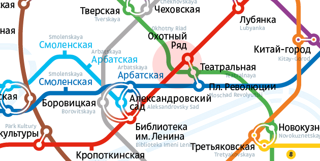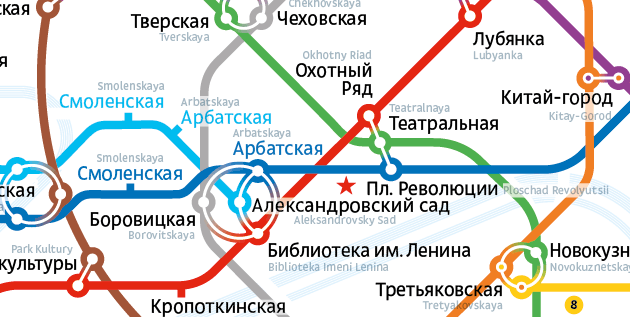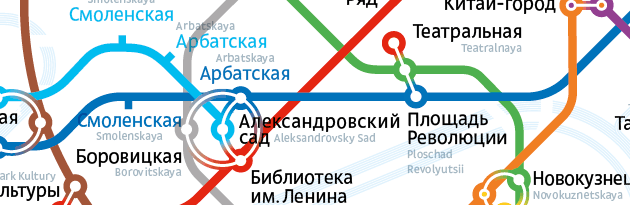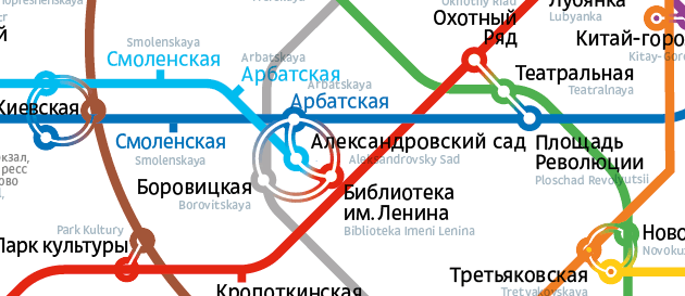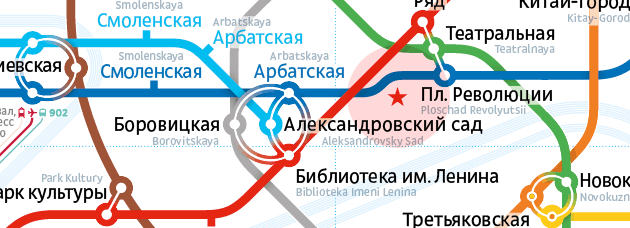 Получив по рукам за такое, дизайнер возвращает прежний вид пересадкам и начинает искать честные способы разместить звезду, «Александровский сад» и «Площадь Революции». И почти получается, только не хватает места звезде, а «Охотный Ряд» отрывается от линии.