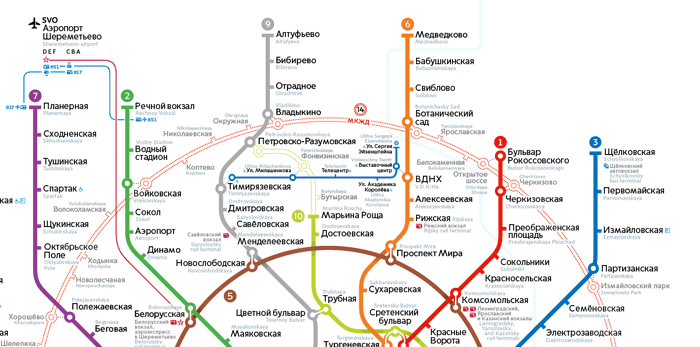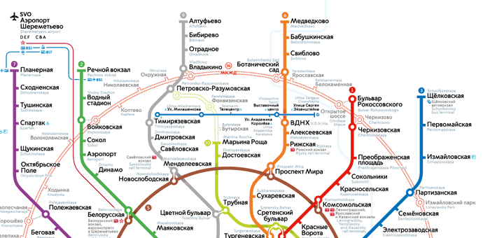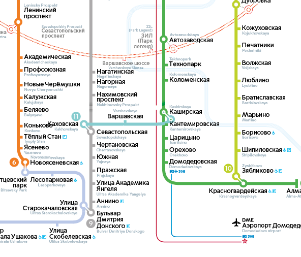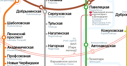 Одно время мы думали, что пересадки длиной больше 300 метров показывать не нужно. И на пересечении Второй кольцевой с седьмой линией пересадок не стало. Жаться не надо, станции расставляем свободно, и получается красота.