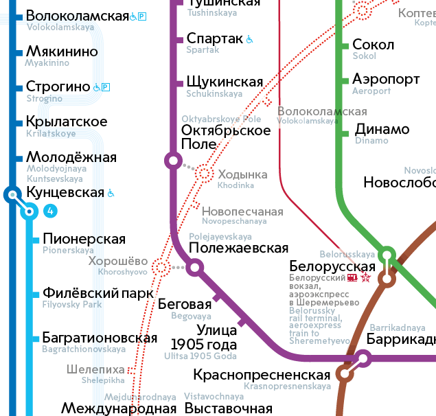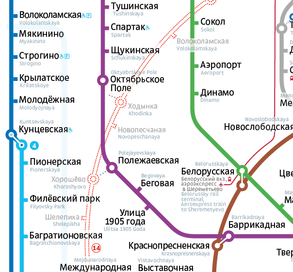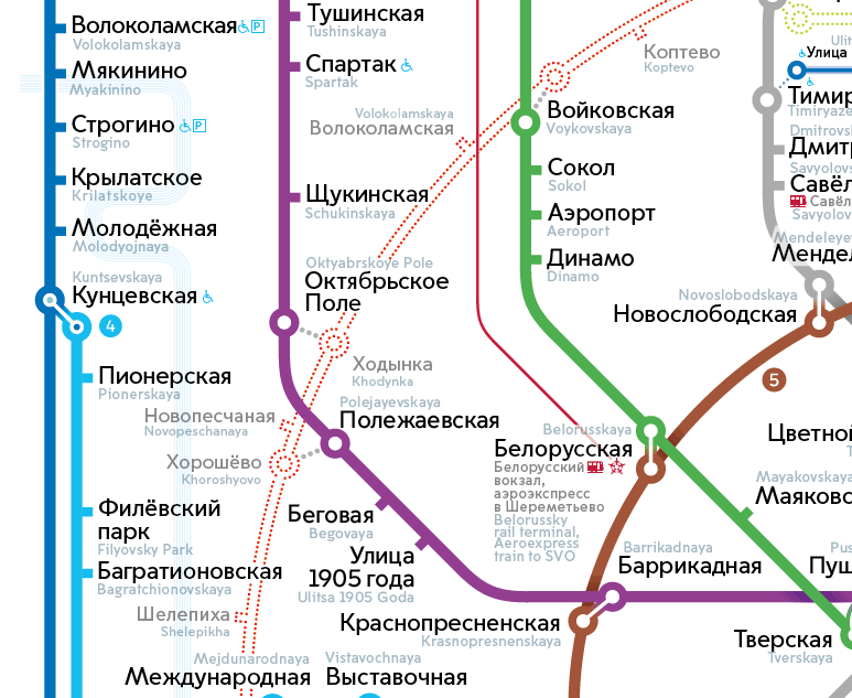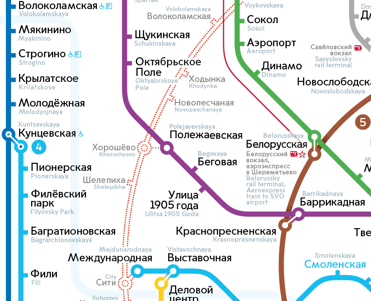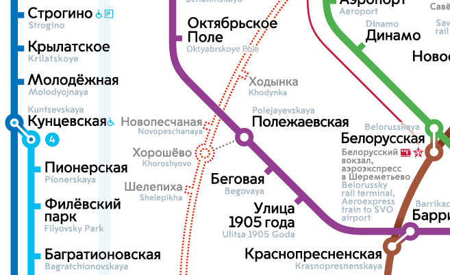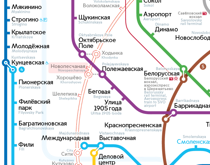 Позже узнаём, что такие пересадки надо показать. Это означает появление связей «Хорошево» — «Полежаевская» и «Ходынка» — «Октябрьское Поле» вновь. И между ними нужно запихнуть «Новопесчаную».