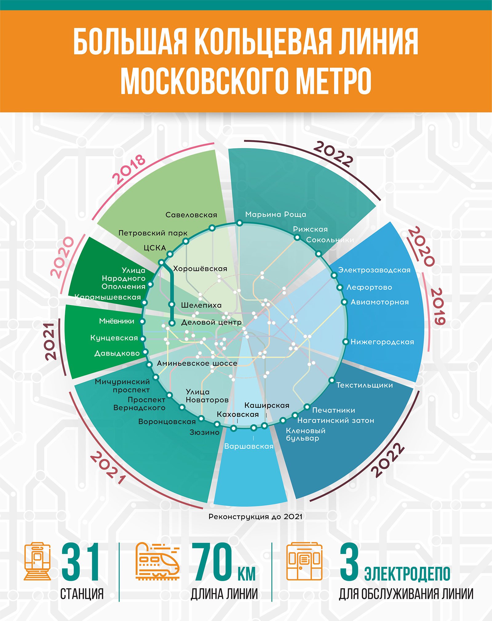 Большая кольцевая линия Московского метрополитена – крупнейший в мире проект метростроения. Длина БКЛ составит 70 км с 31 станцией и тремя электродепо.