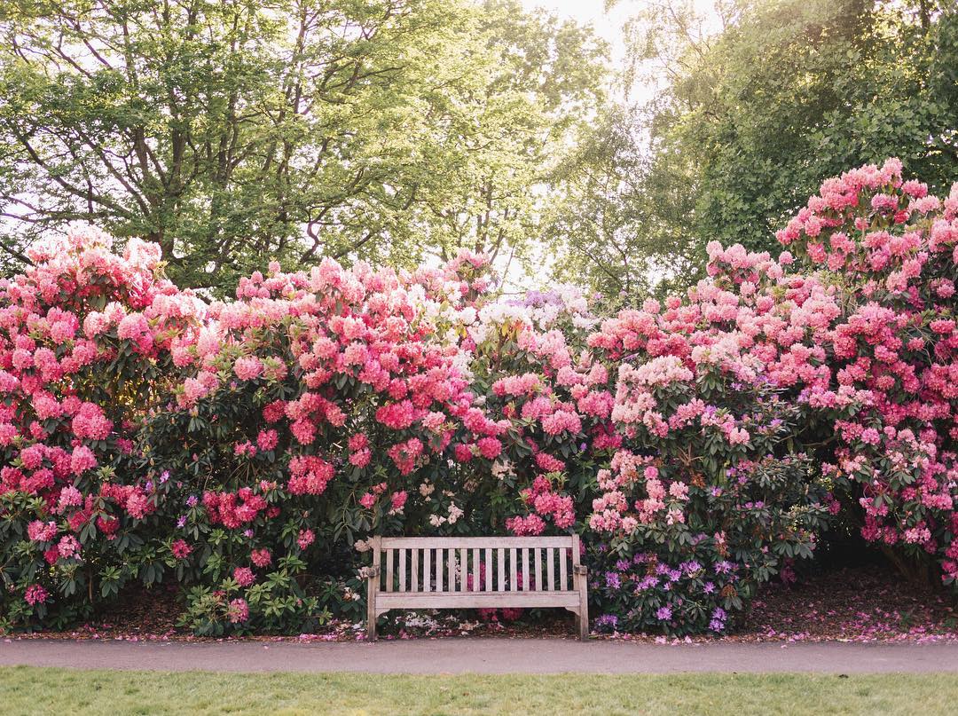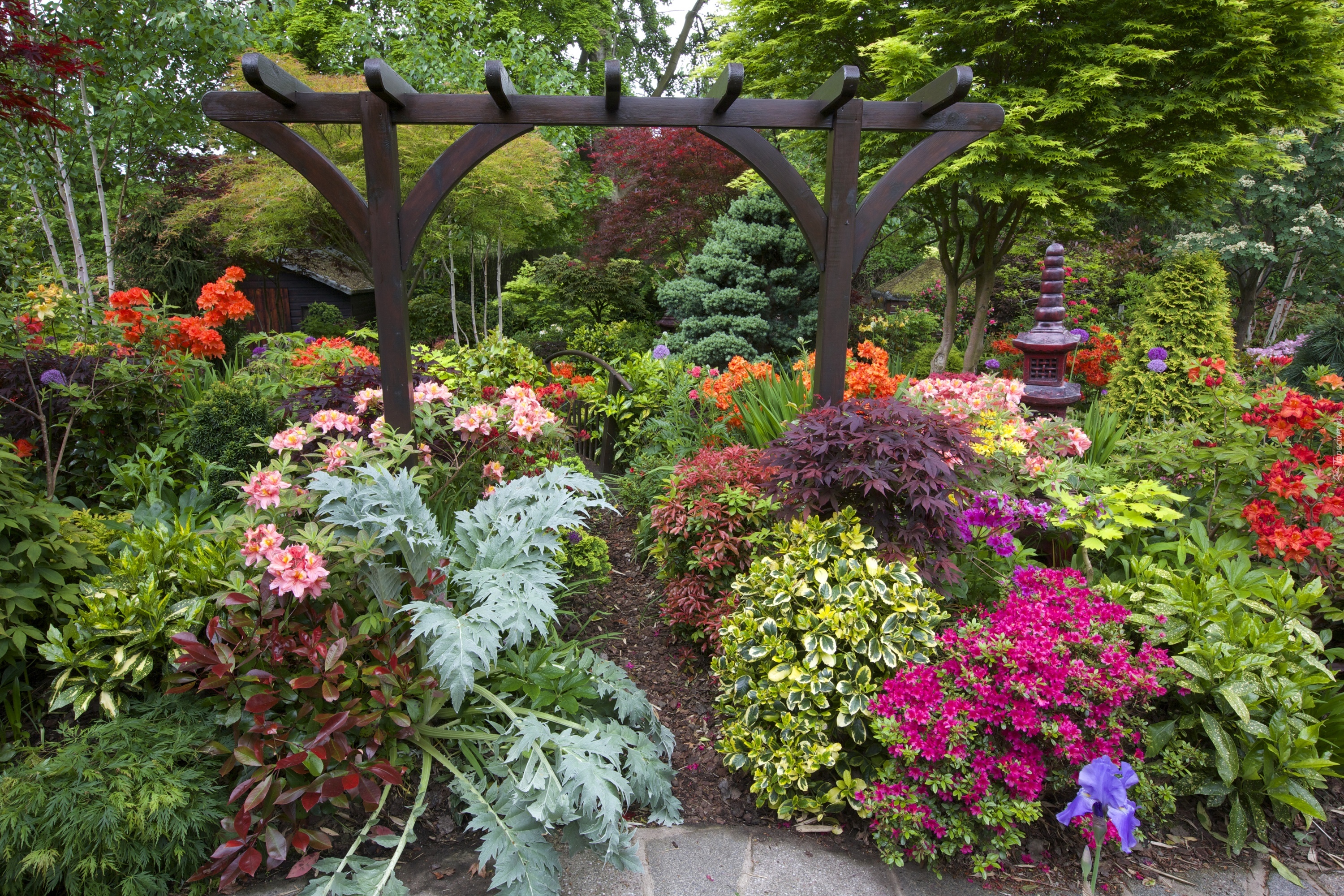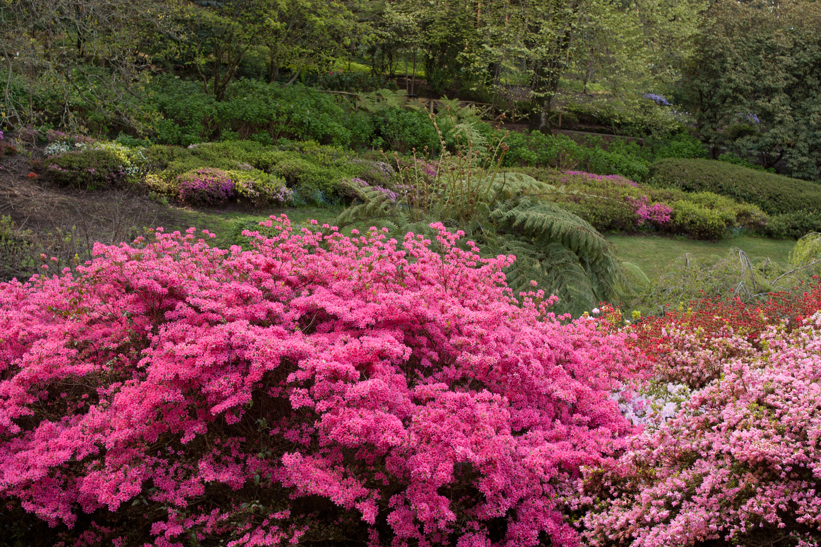 Азалия и рододендрон обеспечивают надежную весеннюю окраску; добавление позднецветущих кустарников продлит зрелище.