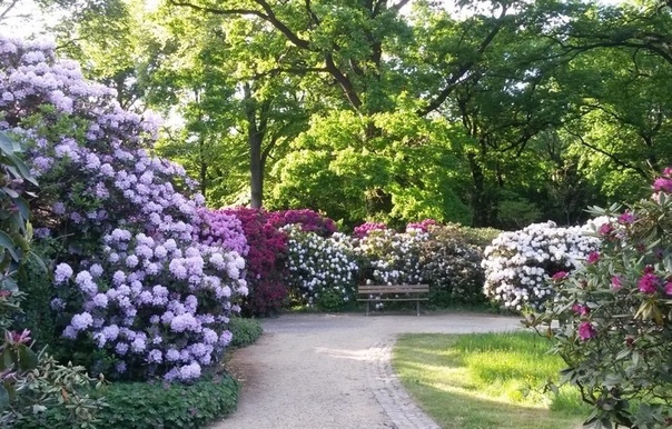 А сорта позднего цветения: крупноцветковый рододендрон разноцветный (R. discolor), розовый «Spatlese» и «Nymphenrose», они зацветают в начале июня.