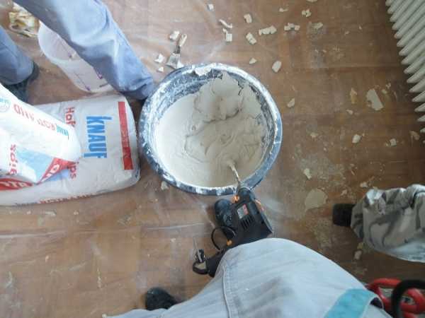 - Далее в бадью добавляется остаток воды и высыпается вся оставшаяся в мешке гипсовая масса;