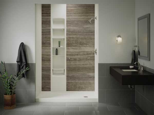 Самым сомнительным является натуральное дерево. Оно чутко реагирует на влагу, разбухает, покрывается грибком и гниёт. Использовать его имеет смысл только в случае, если этого категорически требует интерьер. При этом, вы не часто бываете дома и пользуетесь душем.