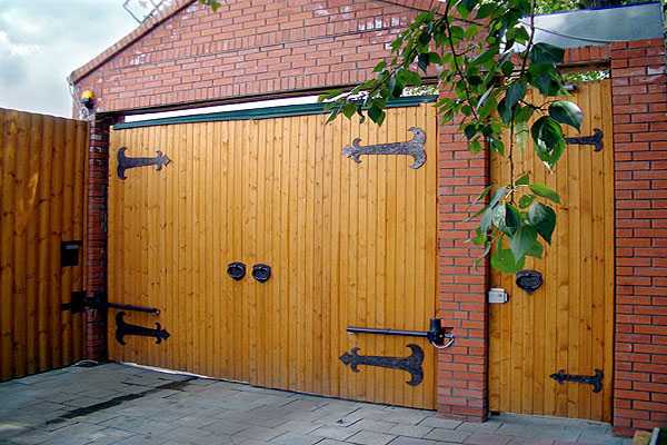Недорогие деревянные ворота из вагонки можно облагородить при помощи дополнительного оформления, например, украсить полотно петлями или окантовкой из металла