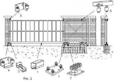 Схема сдвижных ворот: 1 – направляющая; 2 – роликовый механизм; 3 – съемный ролик; 4-5 – два ловителя; 6 – верхний фиксирующий кронштейн; 7 – платформа регулировки