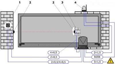 Система автоматического открывания ворот: 1 – кнопка включения; 2 – встроенные фотоэлементы; 3 – электрический привод; 4 – сигнальный фонарь с антенной