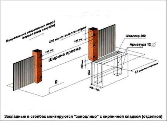 Конструкция закладной устанавливается со стороны, в которую будет отъезжать полотно ворот. При монтаже следует обратить внимание на точность расположения всех элементов