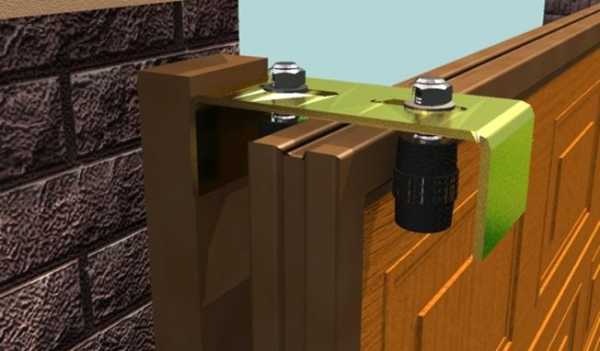 Одна из важных деталей, которую устанавливаем вслед за роликом, – верхний кронштейн. Он защищает механизм ворот от боковых движений. Кронштейн закрепляем на верхней части полотна, повернув отверстия для болтов в сторону опоры. Затем фиксируем его на опорном столбе и проверяем регулировку.