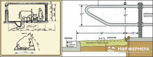 Рисунок 3. Чертежи для строительства стойла своими рукамиКак уже говорилось выше, на одну корову потребуется 6 квадратных метров пола, а если она будет содержаться с теленком – то 9 квадратных метров. При этом нужно оставить проход между стойлами, шириной до 2 метров. Желательно сделать пол под небольшим уклоном (не более 3%), чтобы навозная жижа не скапливалась в стойлах и самотеком выводилась в специальные желоба.