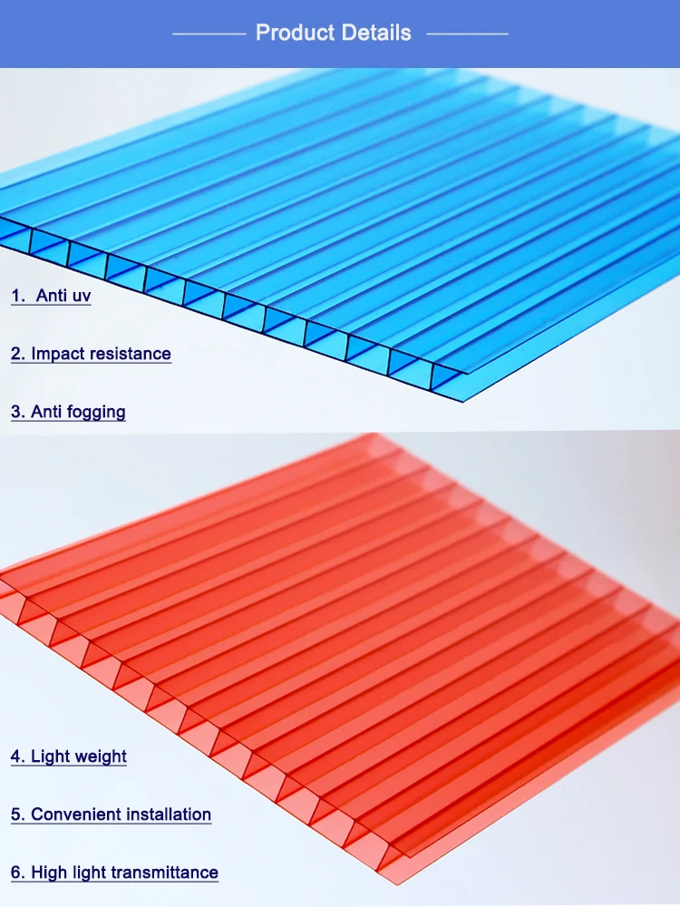 Двустенный поликарбонатный лист, стандартная версия многослойного поликарбонатного листа, является самонесущим и не требует такого количества скользящих стержней, как плавающее стекло, поскольку вес поликарбонатного листа составляет лишь четверть веса стекла. Легкий вес и полая структура вместе способствуют экономии средств и высокому светопропусканию.