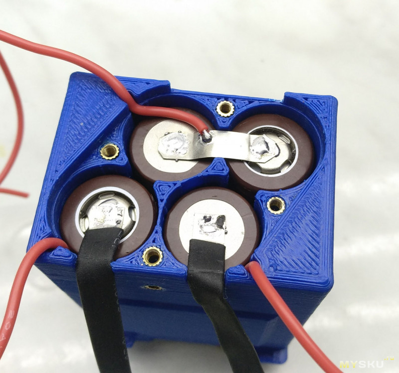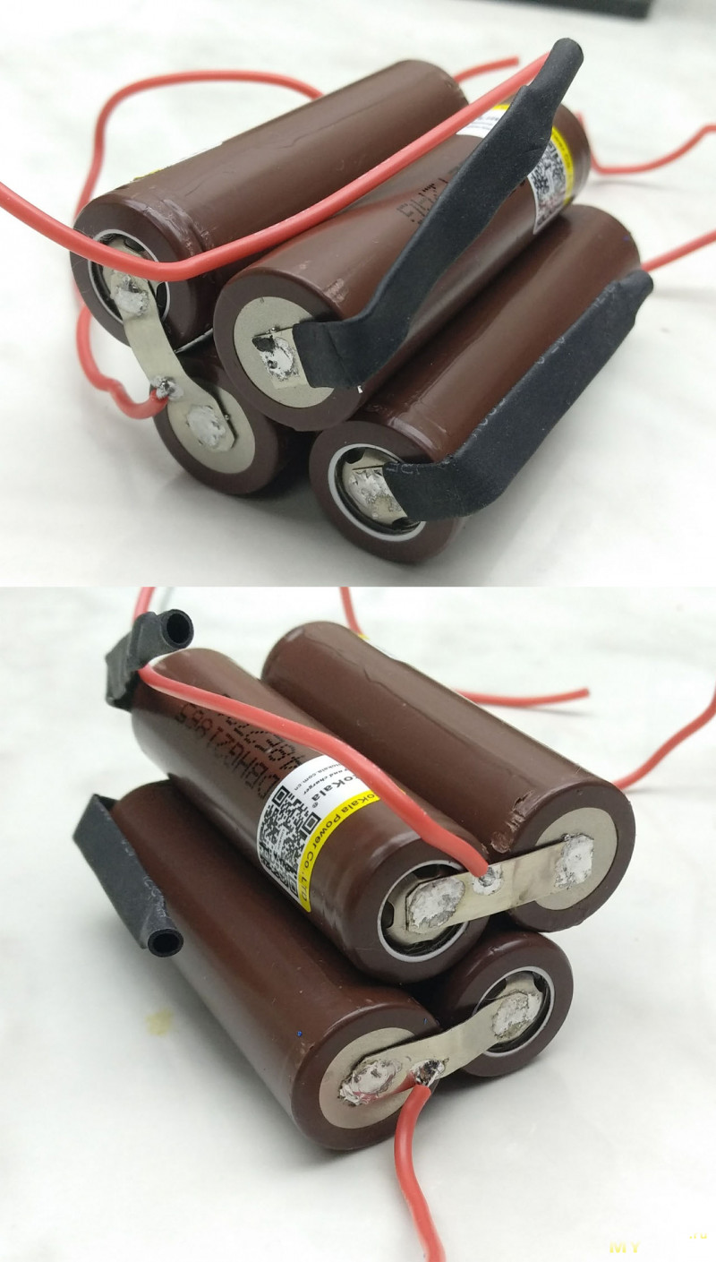 Очень важно: во время пайки и при всех последующих операциях со спаянным блоком аккумуляторов нужно внимательнейшим образом следить за тем, чтобы не замкнуть какие-либо контакты аккумуляторов! Кроме того, как указал в комментариях ybxtuj, очень желательно паять их разряженными, и я абсолютно согласен с ним, так последствия будут легче если все-таки что-то замкнется. КЗ такой батареи, даже разряженной, может привести к большим неприятностям.
