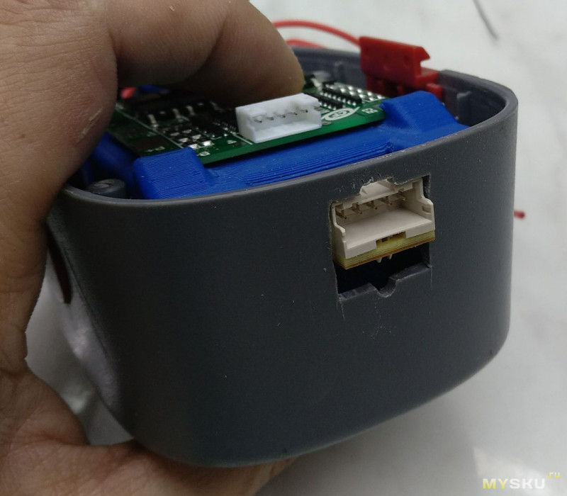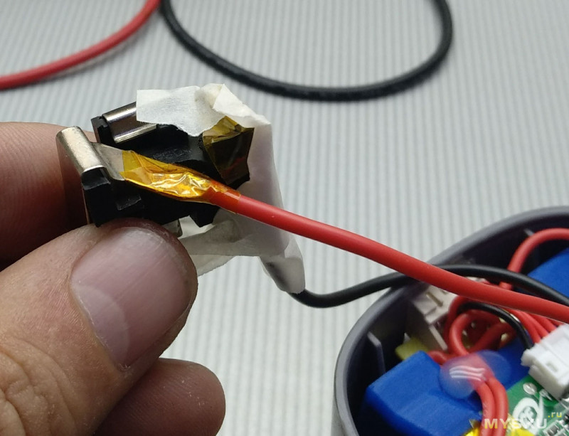 На всякий случай проложил поверх контактов каптоновую изоленту, провода прихватил несколькими соплями каплями термоклея, чтобы они не попали между половинками корпуса при его сборке.