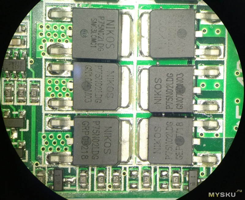 «Пойдем простым логическим ходом»©. Отрубать нагрузку могут только эти микросхемы DW01B, которые контролируют все параметры разряда. И я просмотрел осциллографом управляющие выходы всех четырех микросхем. Все четыре микросхемы никаких попыток отключить нагрузку при старте шуруповерта не делают. А с затворов мосфетов управляющее напряжение пропадает. Или мистика или китайцы что-то навертели в простой схеме, которая должна быть между микросхемами и мосфетами.