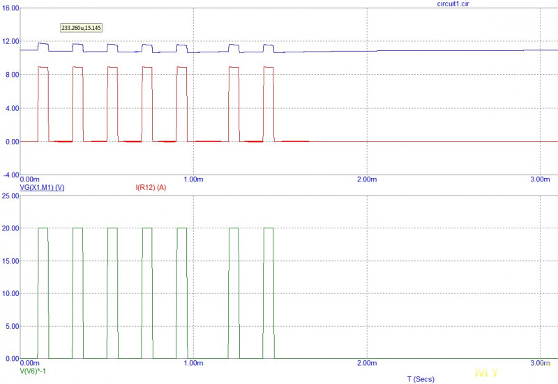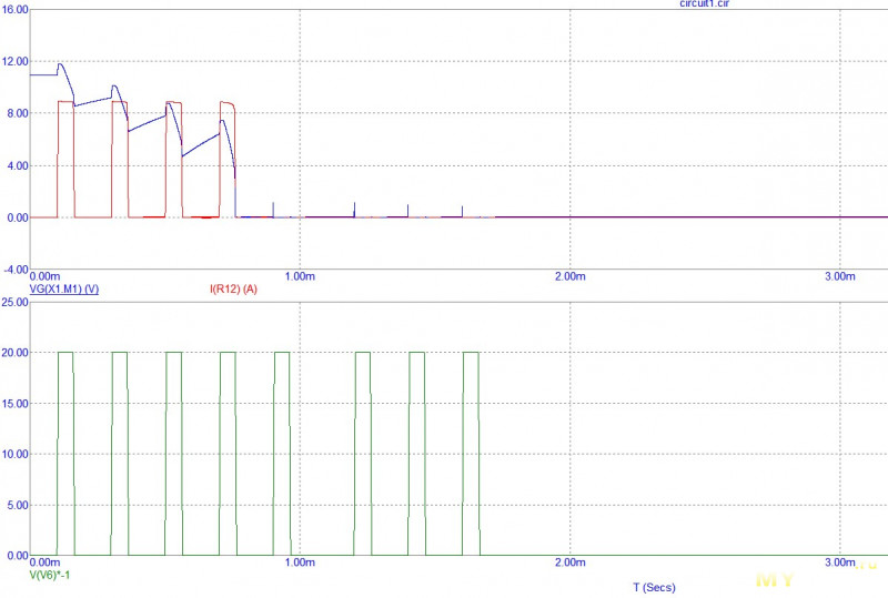 На верхнем графике красным — ток нагрузки, синим — напряжение на затворе мосфета. Как видно, напряжение на затворе (синим) снижается с каждым импульсом тока нагрузки и в конце концов падает до нуля, а значит нагрузка отключается. И не восстанавливается даже когда нагрузка перестает пытаться что-то потреблять (после 2 миллисекунд). И хотя здесь применены другие мосфеты с другими параметрами, картина один в один как в плате BMS — попытка старта и отключение через считанные миллисекунды.
