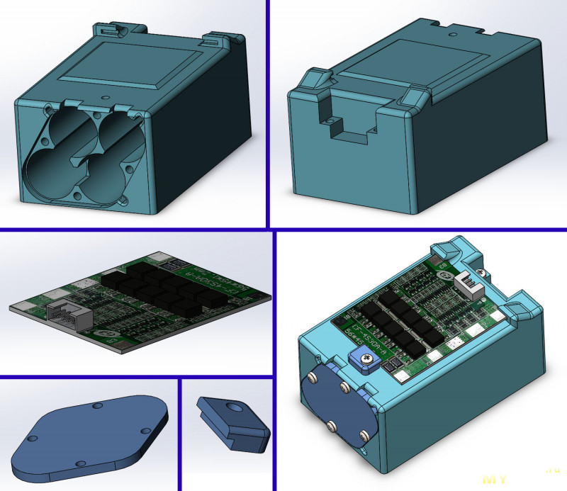 Выбрав свободный день (точнее, нагло послав все остальные дела подальше), я взялся за переделку. Для начала разобрал батарею со сдохшими китайскими аккумуляторами, выкинул аккумуляторы и тщательно замерил пространство внутри. После чего сел рисовать держатель батарей и платы в 3D-редакторе. Плату тоже пришлось нарисовать (без подробностей) чтобы примерить все в сборе. Получилось как-то так: