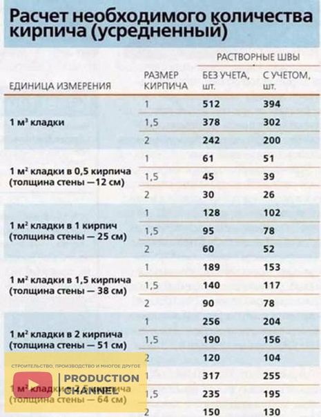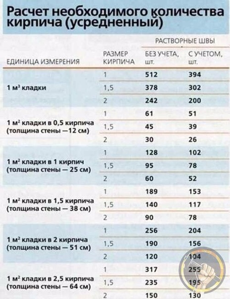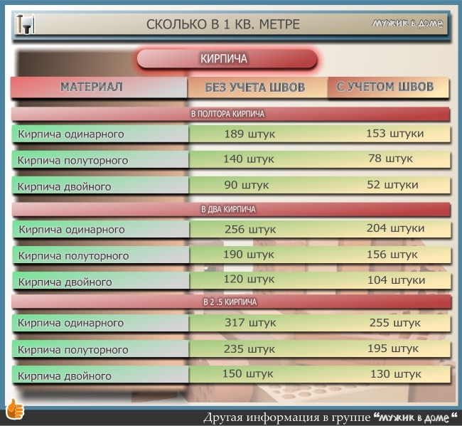 Если, например, требуется кладка в два кирпича полуторным изделием, тогда в одном квадратном метре будет 195 шт. с учетом боя и без учета расходов на швы. Если считать при этом швы (вертикальные 10 мм, горизонтальные 12 мм), то кирпича по подсчетам уходит 166 штук.