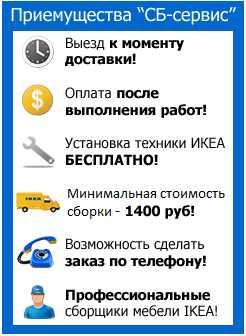 Нам часто задают вопрос: Сколько стоит сборка мебели IKEA у вас? Наша компания осуществляет сборку мебели по одинаковой и стандартной цене для всех клиентов согласно прейскуранту магазина ИКЕА, мы не берем доплаты за скорость, это не этично по отношению к другим клиентам. Мы производим сборку мебели согласно записи. Сверится, с прейскурантом можно на сайте или обсудить стоимость сборки мебели с менеджером компании. Мебель «ИКЕА» на сегодняшний день пользуется большой популярностью за счет высокого качества и надежности, а также отлаженного сервиса, предоставляемого производителем. Сборка мебели IKEA в нашей компании осуществляется с сохранением гарантийных обязательств магазина IKEA. Также у нас сохраняются привилегии по установке техники «ИКЕА». В том случае, если вы приобрели кухню и заказали ее сборку в нашей компании, установка всей купленной техники будет произведена бесплатно! Это значит, что мастера установят и закрепят технику в элементах мебели. Не стоит путать установку техники с ее подключением! Подключение техники оплачивается отдельно по прейскуранту.