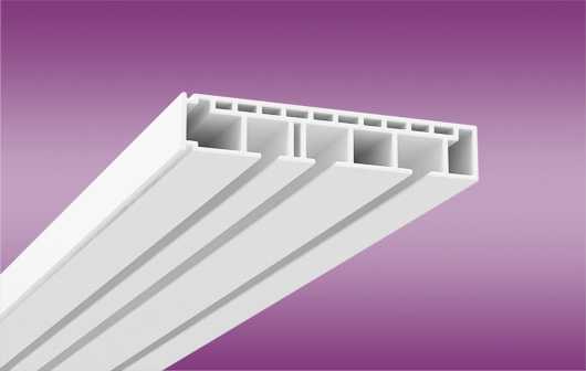 - Оптимальная комбинация лёгкости и прочности. Тонкая пластиковая «доска» практически невесома. Особенно в сравнении с другими видами держателей для штор, в первую очередь металлическими. Малая масса позволяет использовать профиль в сочетании с «капризными» поверхностями — натяжными потолками, стенами из гипсокартона. При этом особенности структуры профиля позволяют ему выдерживать солидный вес. Если уж вы хотите использовать гардины из массивных плотных материалов, можете себя не ограничивать.
