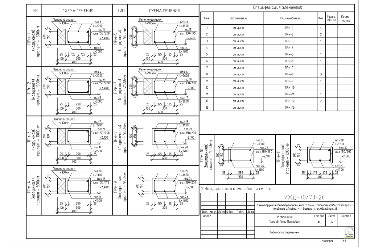 После выполнения ведомости перемычек составляется спецификация элементов перемычек: