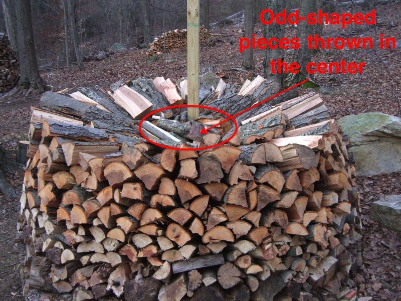 Кругляк посередине, колотые чурки по краям – компактно и устойчиво