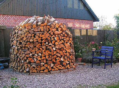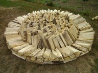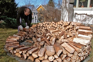 Для этого дрова укладывают радиально, как лепестки ромашки, создавая небольшой подъем в центре, чтобы дождевая вода стекала с такой поленницы. Поленья укладывают ряд за ряд, словно черепицу. Создавая напуск следующего ряда на предыдущий.