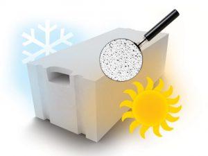 Этот параметр определяет продолжительность эксплуатационного периода объекта. При значительном впитывании вода накапливается в порах, появляются грибок и плесень. Для газобетонного блока такой показатель составляет 100 %, кирпич же может похвастаться значением в 6 – 14 %. Понизить поглощаемость воды блоком возможно, отделав поверхность стен гидроизоляционным материалом и штукатурным раствором.