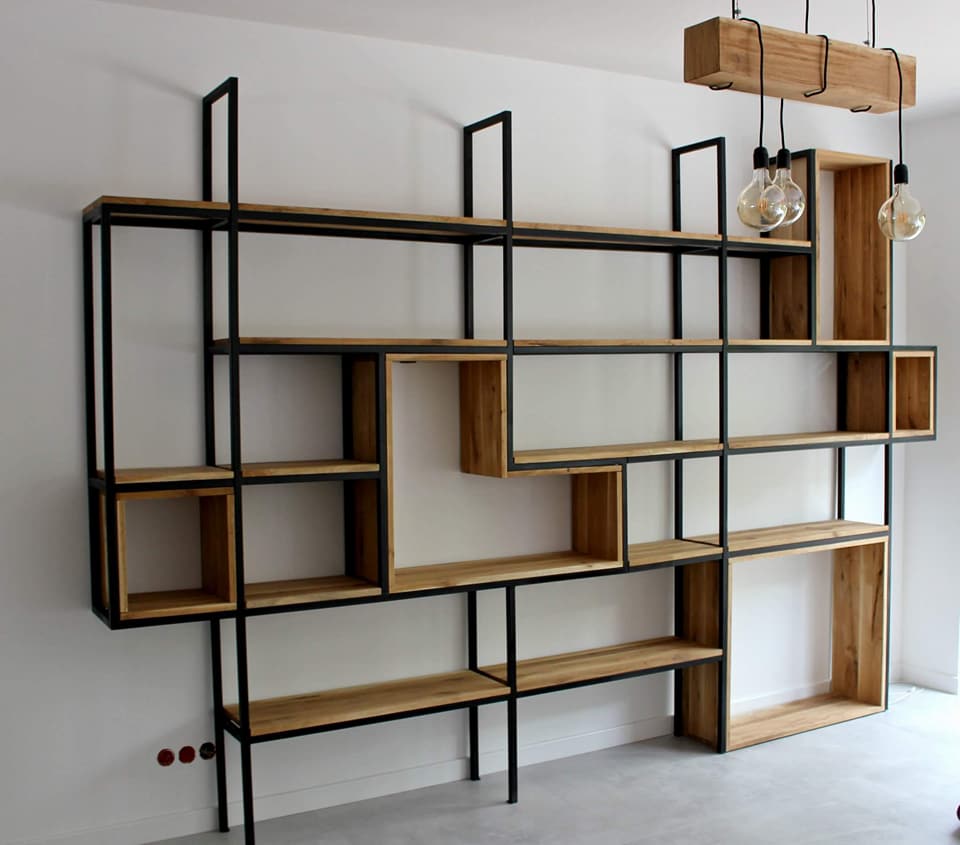 Такой материал выдерживает высокие нагрузки, он крепок и долговечен. К минусам трубы из металла можно отнести небольшую функциональность. При изготовлении стоит сразу определиться с расстоянием между полками, так как в будущем их регулировка не будет доступна.