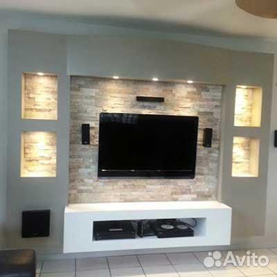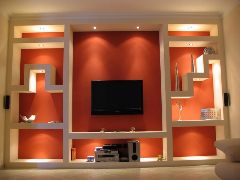 | Современная отделка стен из гипсокартона и дизайн интерьера полок для ТВ стены |