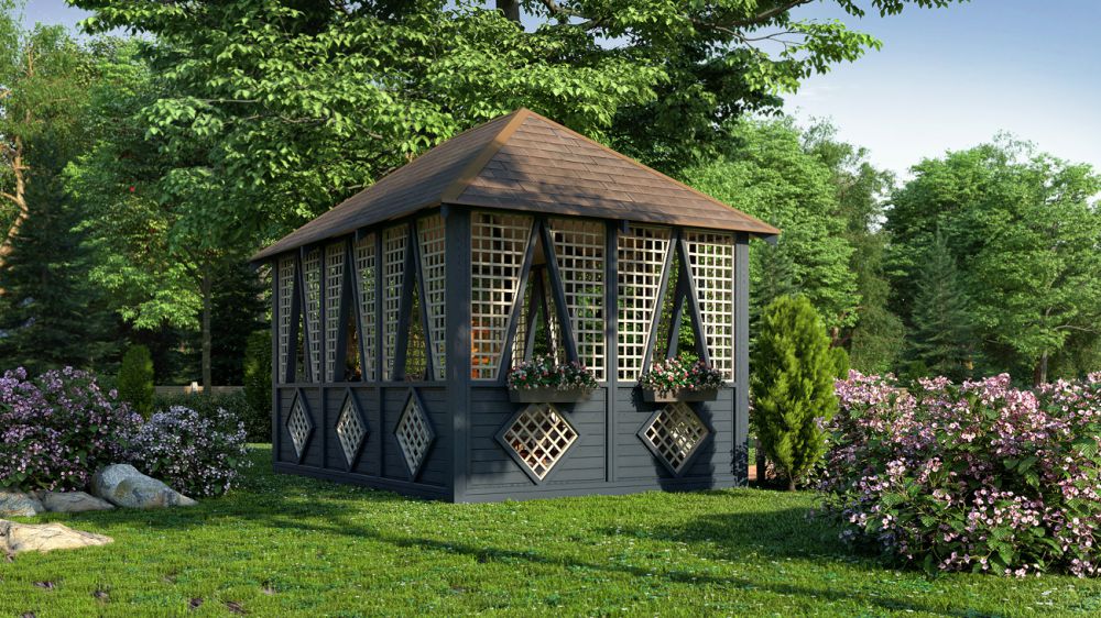 Беседка — это отдельно стоящая конструкция с восьмигранной крышей. Беседки можно установить на верхнюю часть настила или установить на бетонную плиту. Вы можете приобрести комплекты беседок различных размеров и стилей с предварительно смонтированными стеновыми и кровельными панелями для облегчения установки. Единственным реальным недостатком приобретения комплекта беседки является то, что они очень дороги и могут быть повреждены при доставке.