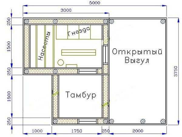 Во время составления плана важно учитывать место, которое понадобится для вольера, необходимого для выгула птиц. Его параметры связаны с основным помещением, и для строения шириной 2х2 м2 вольер составит 2х6 м 2.