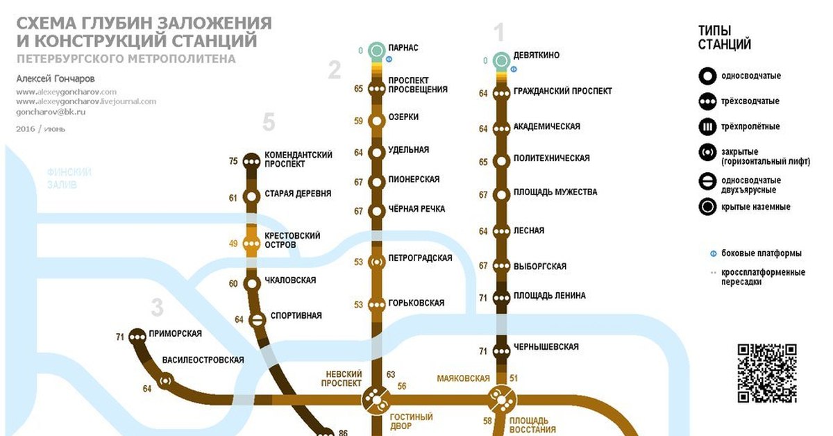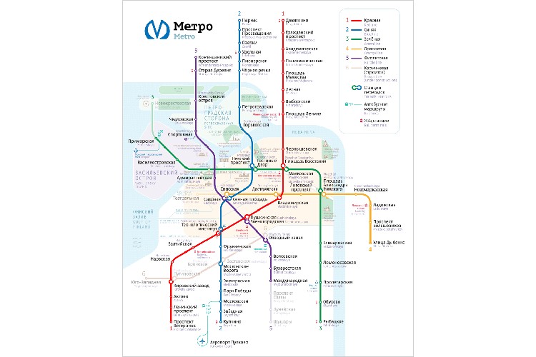 Также отмечены железнодорожные вокзалы. Невско-Василеостровская линия состоит полностью из станций типа «горизонтальный лифт».